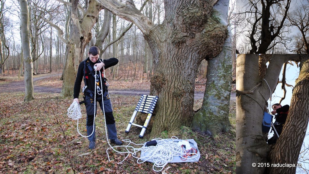 După nenumărate încercări (pe bune, chiar nu am numărat, dar a durat vreo jumătate de oră), am reușit să am în sfârșit coarda în copac. Abia apoi am scos toate celelalte din rucsac și m-am echipat :D